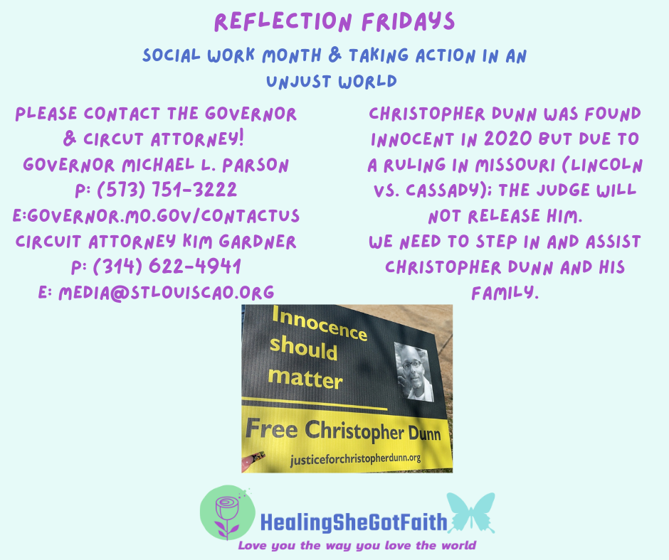 Hey Faither, Happy Friday! I have not done one of these in a while. But I have a special Reflection Friday today. This week I had the opportunity to participate in a rally for a man who was declared innocent by a judge in Missouri but has not been released due to laws and policies. As some of you may know, I reside in St. Louis, Missouri, and I am a ride or die for St. Louis. I moved to New York for some healing when my mom passed away. During this, the world watched as George Floyd was murdered on TV. I joined multiple protests daily with blisters up and down my feet (I had to go to the doctor). Before this, I was in STL at every protest for many injustices. I really hate the injustice systems in this country. With that being said, on Wednesday, one of the community activists, Ohun Ashe of STL, posted a flyer for a #ChristopherDunn who was proven innocent by a judge in 2020. Now, I remember this case. I remember learning about Christopher and how Missouri has failed yet another family and US citizen once again. Everyone says, "Make Amerikkka great again." But when was it great? When did it benefit anybody else but white men? When I saw this flyer, I decided that day I was going to the rally. I had the opportunity to meet Christopher's mom, wife and sister, and some childhood friends. We had a great conversation about the case, the laws, and the injustice systems. This is near and dear to my heart because I've watched the racist injustice system tear apart many families in St. Louis alone! I've had to contact attorneys and write many letters on families' behalf. Being here mattered to me because I wanted Christopher home. There is no way someone is proven innocent, but a SYSTEM keeps them locked in. Growing up, we were taught everyone in jail is terrible and that they deserve to be there. As an adult, I have indeed seen how big of a lie that has been. When Mike Brown was murdered by that evil man with a badge, people ridiculed Mike Brown when he was the one who was murdered. I've watched cops harass multiple people throughout my years. I've even been in a car with all black people, but because I am a white-passing Puerto Rican, I've been asked, "Are these really the people you want to hang out with?" All we were doing was pulling over in our residential neighbor in front of our house eating McDonald's. I've seen cops tell people to turn off their phones and ask people who will society believe them or us? Ever since high school, I've noticed how society treats people and how they teach us. One of my earliest encounters with a therapist was her asking me if I was depressed because I went to a predominantly black school. Because God forbid that white students do not do anything horrific. When I saw the flyer on social media this week, I thought I needed to be there. They're asking for support. It is not easy to ask for help in general. But imagine going to court multiple times and fighting for justice for your loved one and hearing a judge put on public records that your loved one is innocent, but there is a law in place in this racist system that keeps your loved one behind bars. The community needs us. As an ally, as a social worker, while it is social work month and being a human on this Earth, I felt it in my soul to show up for the family. Yes, I had the stuff to do before and after. I was only there an hour, but I made time to be there because it was that important. Christopher Dunn should be home. He should not be held, especially since being found innocent by a judge. Christopher Dunn was arrested at 18 and was charged with murder. He was sentenced to life in prison without parole. While speaking to the family of Christopher Dunn and they were telling me about his case, and I was telling them about another very similar case (yes, in STL too). They told me that the key witnesses did come back on their story and changed their story. Meaning they admitted that the original story was not valid. In 2020, Christopher Dunn had an evidentiary hearing where the judge said he was innocent. But the judge will not release him even though he has found Christopher innocent. Now there is a ruling in Missouri titled Lincoln Vs. Cassady. Basically, this says that you will not be released unless you're on death row while being proved innocent. So, Christopher is innocent, but he did not receive death row; he received life without parole. Missouri will not release him. An innocent man has been sitting in jail for at least 32 years since he was 18 convicted of a murder that he did not commit, a judge has even found him innocent, and he is not released. I need all my allies, community supporters, social workers, and humans who have the heart to contact